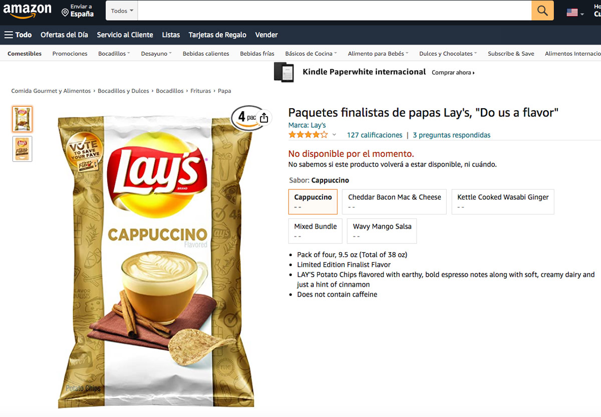 PD: Las patatas fritas sabor capuccinno fueron finalistas del concurso de Lay’s y llegaron a comercializarse en 2014 como edición limitada. Todavía quedan rastros de su paso por Amazon EE UU y hubo quien llegó a catarlas, puntuarlas y escribir sus impresiones en una reseña. Pero, para fortuna de nuestros paladares, la idea no triunfó y el producto no existe. 😉