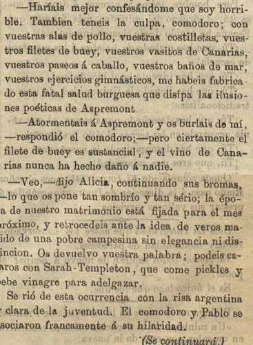 Además de los sucesos, las referencias a esta práctica de tomar vinagre para adelgazar aparece con frecuencia en la prensa del momento. La encontramos mencionada como un elemento más dentro de otros artículos más amplios y, también, reflejada en los textos de ficción populares. Un ejemplo de esto último puede ser Jettatura, el folletín que publicaba El Pabellón Nacional en el siglo XIX. El fragmento que sigue es un diálogo y pertenece al capítulo del 19 de febrero de 1881: