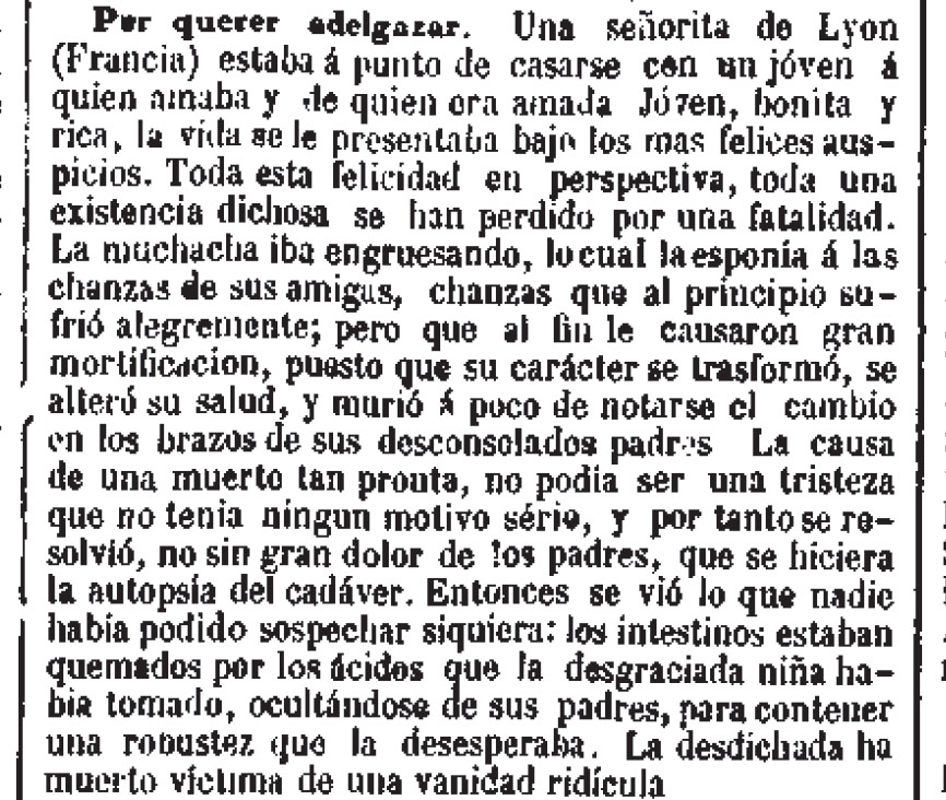 Casi siete años después, y a 1300 kilómentros de Lyon, la prensa dio cuenta de un suceso parecido en España. La víctima también era una chica joven y el objetivo era el mismo: adelgazar, ajustarse al canon estético del momento, ser querida, gustar. El diario La Soberanía Nacional lo contaba de esta manera: