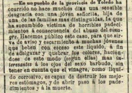 «En un pueblo de la provincia de Toledo ha ocurrido no hace muchos días una sensible desgracia con una joven señorita, hija de una de las familias más distinguidas, que ha sucumbido víctima de horribles padecimientos a consecuencia del abuso del vinagre. Hacemos público este caso, para que sirva de aviso y escarmiento a muchas jóvenes que beben con exceso este líquido, a fin de adelgazar y quebrar los colores, haciéndose de este modo (según ellas) más interesantes a los ojos del sexo barbudo sin tener en cuenta que el vinagre, como líquido corrosivo, es capaz de destruir los mejores estómagos, y de abrir paso a los padecimientos y a la muerte».