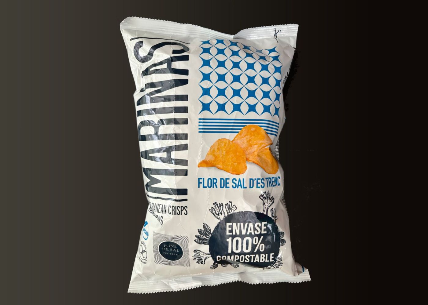 Justamente, aquí es donde surge otro interrogante. Porque resulta que ha habido un cambio. Las patatas Marinas, que ahora tienen un 0,06 % de flor de sal D’Es Trenc mezclada con sal común, hace apenas tres años utilizaban solo flor de sal, como se ve en este paquete más antiguo: