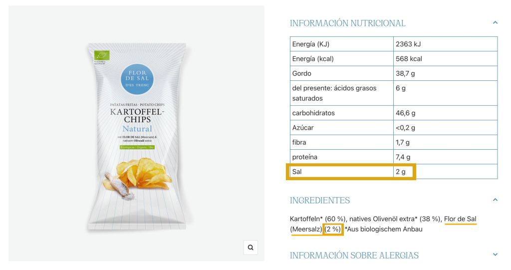 - En la lista de ingredientes, donde es obligatorio detallar el contenido de aquellos ingredientes que se han destacado o usado como reclamo, leemos algo que puede parecer lo mismo pero es radicalmente distinto. Dice así: «Patata, aceite de girasol (27 %) y sal (con flor de sal de Salines d’Es Trenc 0,6‰)».