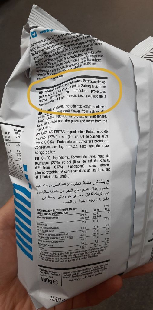 Esto explicaría por qué hay otra marca de patatas que utiliza esta misma sal especial y, sin embargo, no necesita hacer mezclas. Según se ve en la información nutricional y en la lista de ingredientes, toda la sal de estas otras chips (un 2 %) es flor de sal d’Es Trenc.