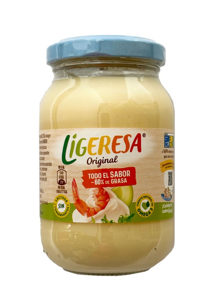 Agua, aceite de soja (25%), vinagre de vino, almidón de TRIGO, yema de HUEVO pasteurizada, azúcar, sal, jarabe de glucosa deshidratado, almidón modificado, espesantes (goma garrofín y goma guar), colorante (carotenos), aroma.