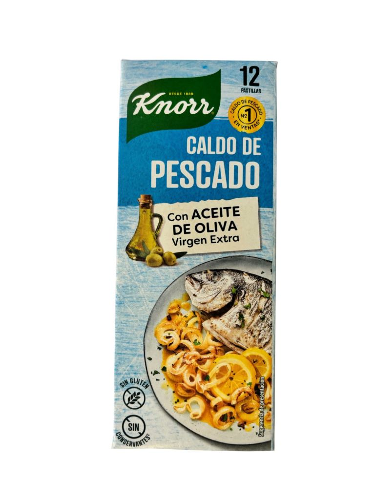 Sal, potenciadores del sabor (glutamato monosódico, inosinato y guanilato disódicos), grasa de palma, BACALAO (5,4%), grasa de palma totalmente hidrogenada, extracto de levadura, aceite de oliva virgen extra (2%), azúcar, especias (contiene APIO), CAMARÓN (0,6%), cebolla (0,5%), maltodextrina, jarabe de caramelo, aromas, extracto de vino blanco, estragón. Puede contener moluscos.
