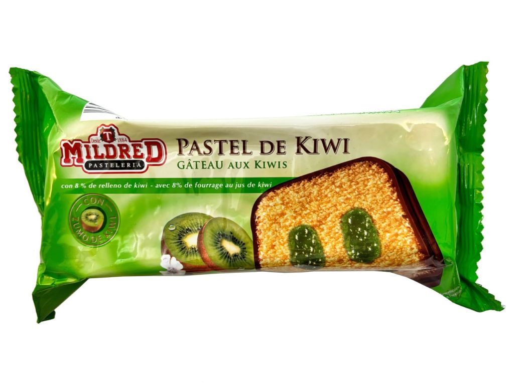 Azúcar, HUEVOS, harina de TRIGO, grasa de palma*, almidón de TRIGO, jarabe de glucosa-fructosa, humectantes: sorbitoles, glicerina, grasa de palma totalmente hidrogenada*, cacao en polvo bajo en grasa, 0,4% zumo de kiwi, 0,3% kiwi, zumo de manzana, sal, gasificantes: difosfatos, carbonatos de sodio; emulgentes: monoglicéridos y diglicéridos de ácidos grasos, triestearato de sorbitán, lecitinas; aroma natural, reguladores de acidez, acetatos de sodio, ácido cítrico; gelificante: pectinas, zumo de limón concentrado, extracto vegetal (cártamo, algas), colorante: carotenos. (*Aceite de palma certificado). Este producto puede contener restos de FRUTOS SECOS y derivados de LECHE.